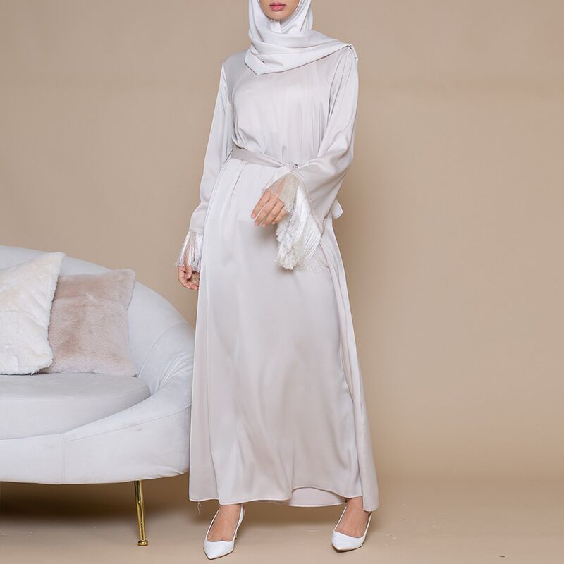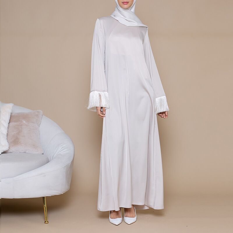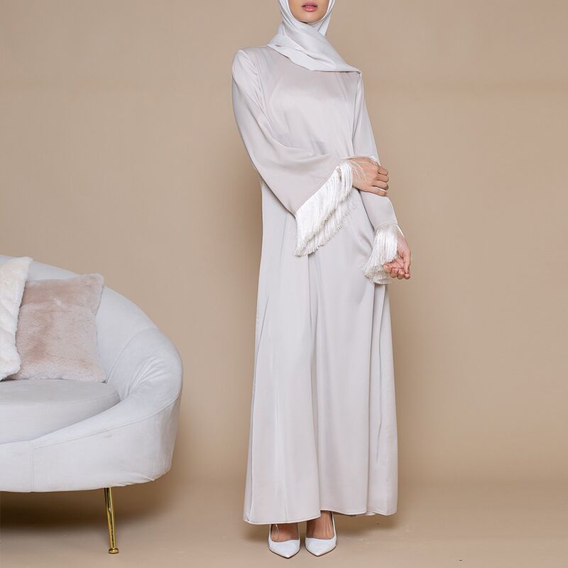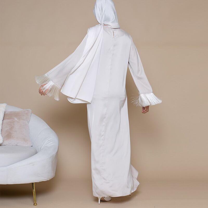 Magnificent long fringed dress for your occasions. We offer you this magnificent dress designed in a flowing fabric of very good quality. Slightly transparent fabric, very pleasant to wear. You will love the quality fringes on the cuffs which give a chic and classy effect. Fairly wide cut . Round neck Wide sleeves. Removable belt You can accessorize as you wish with a belt, jewelry and other accessories.